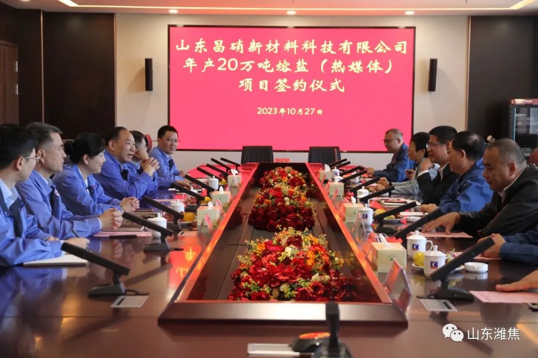 10月27日上午10:58分,山東昌硝新材料科技有限公司20萬噸/年熔鹽(熱媒體 )項目合作簽約儀式在集團(tuán)總部舉 行。濰坊昌盛硝鹽投資公司董事長牟紅光、濰坊振興日升公司總經(jīng)理劉峰祥作為合作雙方代表進(jìn)行簽約。朱劉街道黨工委書 記董建濤、昌樂縣化工產(chǎn)業(yè)發(fā)展服務(wù)中 心主任王俊鳳,集團(tuán)董事長劉良玉、副總經(jīng)理呂紅,濰坊昌盛硝鹽投資控股公司負(fù)責(zé)人牟邦志等出席簽約儀式。簽約儀式由集團(tuán)公司總經(jīng)理王讀福主持。